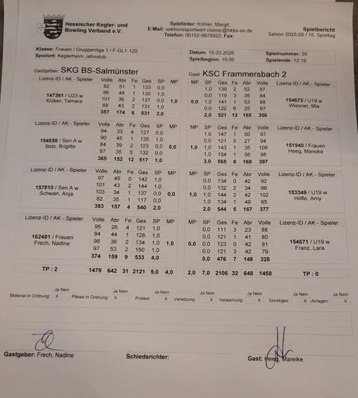 Im Spiel gegen Frammersbach 2 begann Tamara Klüber und erspielte mit 531 LP ein ordentliches Ergebnis nach längerer Pause. Sie konnte gegen Mia Wiesner 521 LP auch den ersten Punkt einfahren. Brigitte Betz mit 517 LP hatte hingegen das Nachsehen gegen Mareike Heeg, die starke 565 LP erkegelte und Frammersbach in Führung brachte.