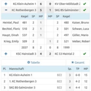 Zum Schluss versuchten dann Günther Gutsche mit guten 559 LP und Florian Ronge mit 555 LP das Spiel noch zu drehen und holten Holz um Holz auf, aber am Ende sollte es wegen 7 Holz nicht reichen. Christian Lapka kam auf 537 und Frank Rickert auf 533 LP. Das Endergebnis lautete 2 zu 4 und 2164 zu 2171 LP. Mömlingen ist damit Tabellenführer.