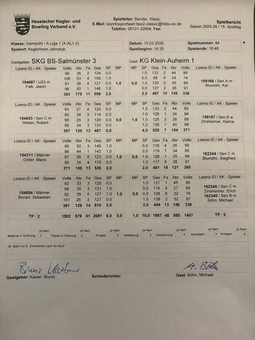 Gegen Klein Auheim begann Jason Falk und Robert Weber. Robert mit 487 LP musste seinen Punkt gegen Karina Zinsheimer 525 LP abgeben. Bemerkenswert aber die starken 558 LP von Jason Falk, der damit punktete und persönliche Bestleistung erspielte. Er gewann gegen Kai Blumöhr, der 487 LP erkegelte.