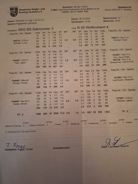 Luca konnte mit seinen 514 auch den ersten Zähler sichern und gewann gegen Horst Dickopf 467 LP. Den nächsten Punkt sicherte sich Jason Falk mit dem besten Ergebnis des Tages und seinen 527 LP. Auch Florian Ronge im Schlusspaar trug sich als Punkteholer ein und erkegelte 509 LP. Einzig geschlagen geben musste sich dann äußerst knapp Bruno Kaiser mit seinen 510 LP gegen Jakob Thomas 515 LP.