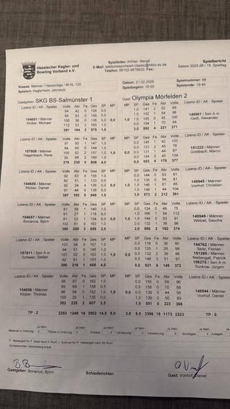 Im Mittelfeld setzten sich die Zeichen zu Gunsten von Olympia, denn Daniel Klüber mit 549 LP und seiner 1 zu 3 Niederlage gegen Christian Vonhof 573 LP konnte, auch geschwächt durch eine Erkältung, nicht seine Leistung abrufen sowie Björn Bonarius mit Knieproblemen ebenfalls nicht. Er erkegelte die schöne Zahl 555, musste aber gegen Sascha Wetzel 566 LP seinen Punkt auch knapp abgeben.