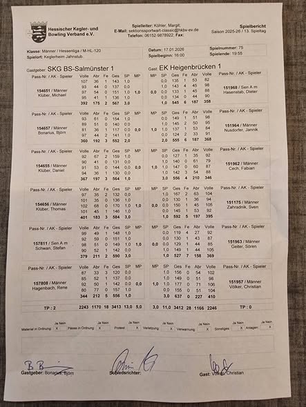 Zu Beginn starteten Michael Klüber und Björn Bonarius für die SKG. Michael hatte im Duell gegen Dieter Hasenstab mit 567 zu 545 den ersten wichtigen Mannschaftspunkt eingeholt, schön für Dieter aber, dass er durchspielen konnte. Björn Bonarius, zuletzt mit durchweg starken Ergebnissen, hatte mit 552 LP gegen Jannik Nußdorfer aufgrund von nur 3 LP knapp das Nachsehen, gerade hier war die 117er Bahn der Knackpunkt für Punktverlust und das für ihn nicht zufriedenstellende Ergebnis.