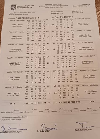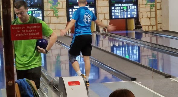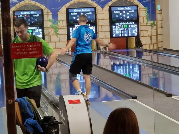 Nun versuchten Daniel Klüber und Björn Bonarius das Spiel dann auch endgültig für die Kurstädter zu entscheiden. Dies sollte beiden dann auch eindrucksvoll gelingen. Björn Bonarius nach Problemen zu Beginn und leichter Verletzung drehte ordentlich auf und war zudem mit seinen 594 LP Tagesbester. Sein Gegenspieler Lucas Frey kam auf 547 LP. Daniel Klüber erkegelte 588 LP und holte seinen Punkt mehr als sicher gegen Andreas Büttner 519 LP. Tolle Einlage zudem von Daniel der das Kunststück schaffte und 7 Neuner in Folge warf. Das sieht man nicht sehr oft und zeigte seine gute Form auf.