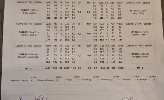 Die weiteren Mannschaftspunkte holten Mario Göller mit 492 LP deutlich gegen David Sauter 418 LP. Jason Falk erkämpfte sich den Punkt trotz der schlechteren Holzzahl mit 497 LP gegen Emily Krieg 516 LP. Auch geschuldet durch einen Aussetzer in Durchgang 2. Auch Bruno Kaiser konnte den Punkt mit 493 LP gegen Liam Sauter 482 LP einsammeln.