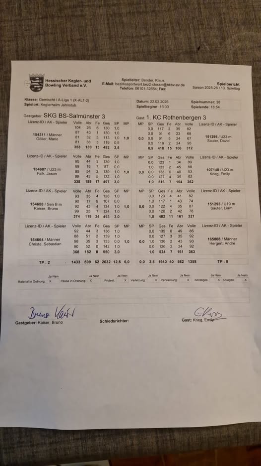 Die weiteren Mannschaftspunkte holten Mario Göller mit 492 LP deutlich gegen David Sauter 418 LP. Jason Falk erkämpfte sich den Punkt trotz der schlechteren Holzzahl mit 497 LP gegen Emily Krieg 516 LP. Auch geschuldet durch einen Aussetzer in Durchgang 2. Auch Bruno Kaiser konnte den Punkt mit 493 LP gegen Liam Sauter 482 LP einsammeln.