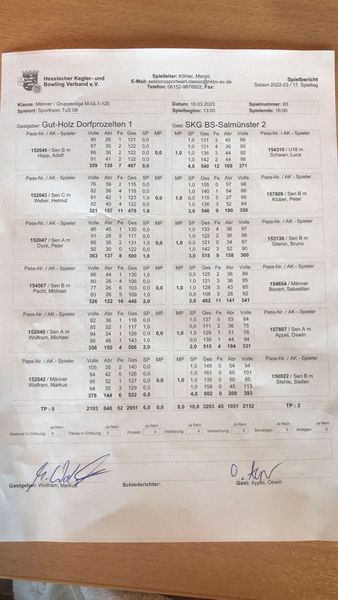 Die Schlusspaarung bildeten Oswin Appel gegen Michael Wolfram und Stefan Stehle gegen Markus Wolfram. Oswin setzte sich mit 2 zu 2 Satzpunkten und 515 LP zu 506 LP durch. Stefan zeigte eine sehr starke Leistung und kegelte das beste Tagesergebnis mit 602 LP. Er lies seinem Gegner Markus praktisch keine Chance und setzte sich mit 4 zu 0 Satzpunkten durch. Markus erspielte das beste Ergebnis der Gäste mit 522 LP.